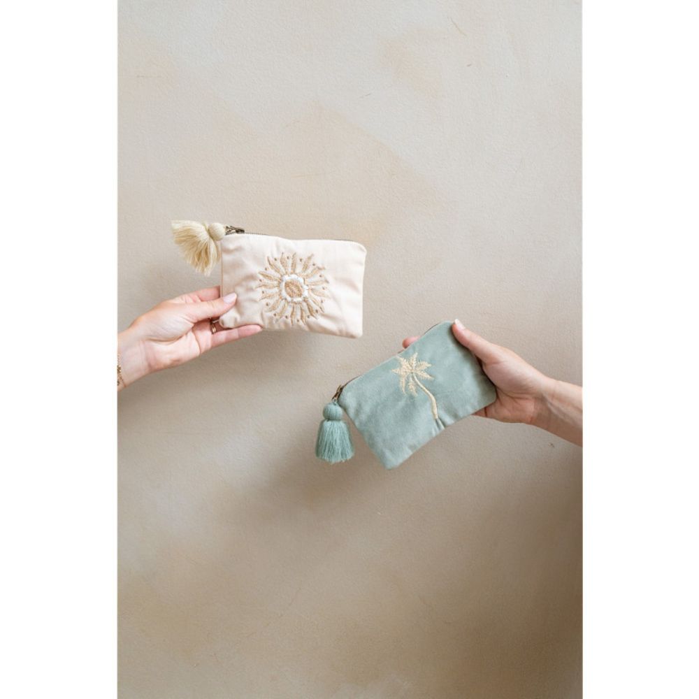 De Home Society Toilettas Holiday Beige is een vrolijke en handige toilettas met een speelse uitstraling ⨠De tas is uitgevoerd in beige velvet (fluweel) en heeft een mooi zon borduursel, wat zorgt voor een frisse en zomerse look.