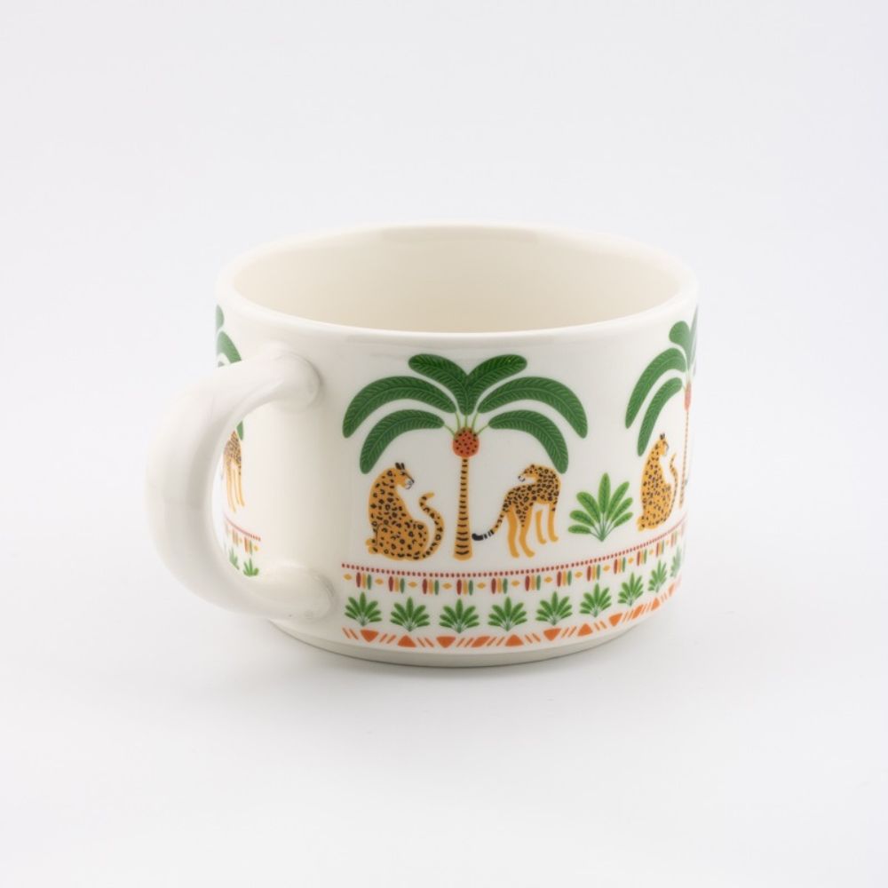 Maak van elk koffiemoment een tropisch mini-momentje met de koffiemok Verde. Het stijlvolle design met groene accenten wordt speels aangevuld door de palmboom en het luipaarddetail. Een frisse, zomerse combinatie die meteen opvalt en zorgt voor een vrolijke uitstraling.
