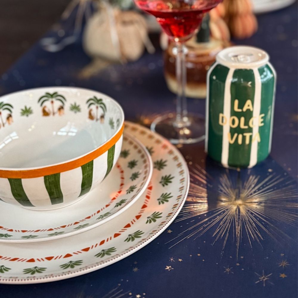 De Verde kom van Homebound by KY maakt van elk eetmoment een klein feestje. De frisse groene accenten in combinatie met de palmboom en het speelse luipaarddetail geven dit schaaltje een trendy en eigenzinnige uitstraling.