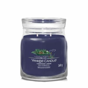 Yankee Candle Lakefront Lodge brengt je naar een stevige en koele nacht met uitzicht op de bossen terwijl de maan weerkaatst op het meer.